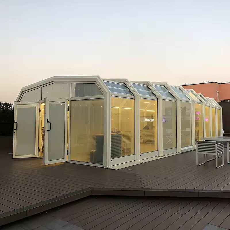 แผงกระจกอลูมิเนียมเคลือบสีฝุ่นแบบพับได้ ปรับเปลี่ยนรูปแบบได้ พร้อมไฟ LED สำหรับห้องซันรูม ปรับแสงแดดได้