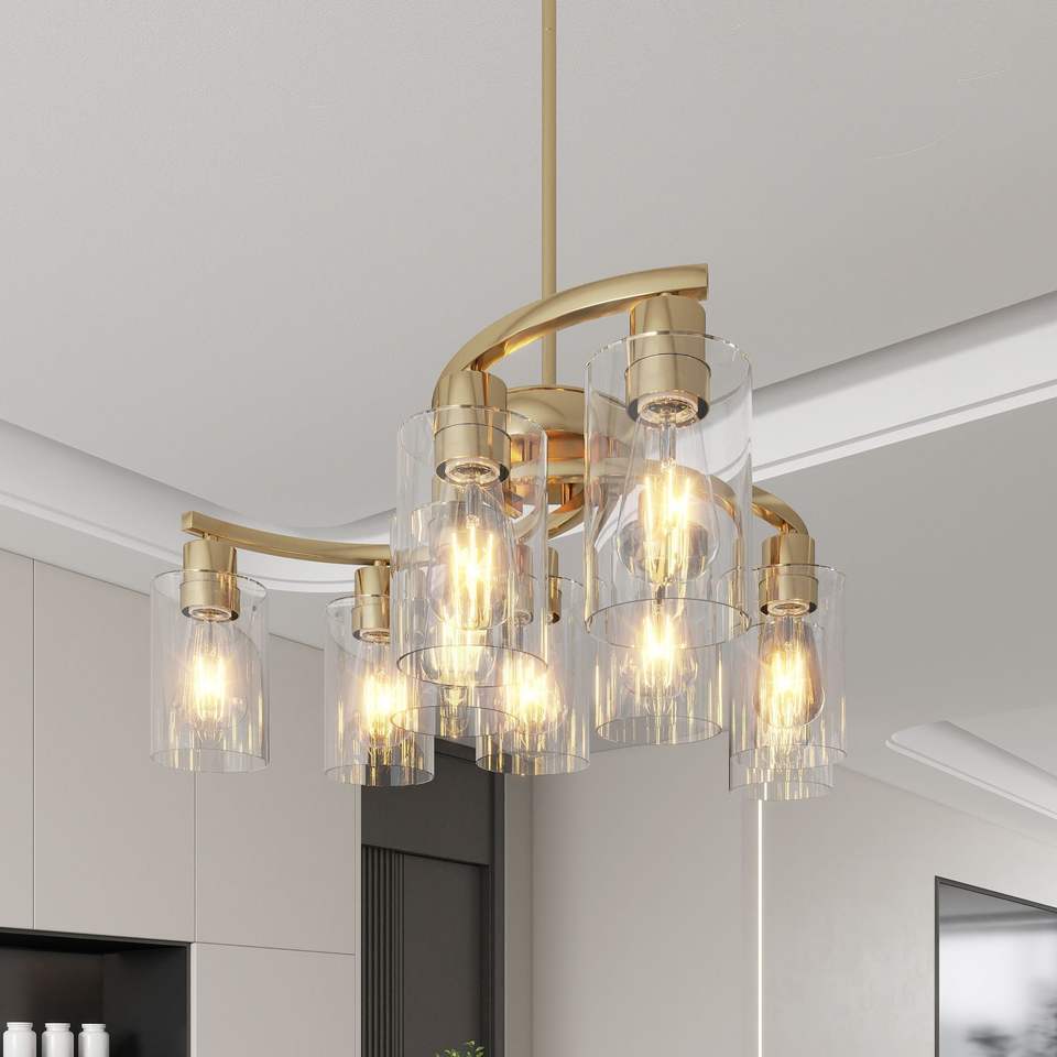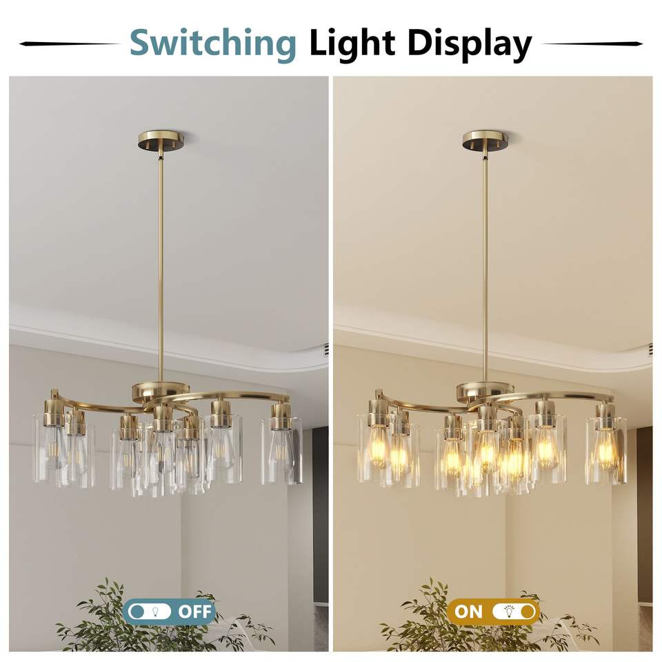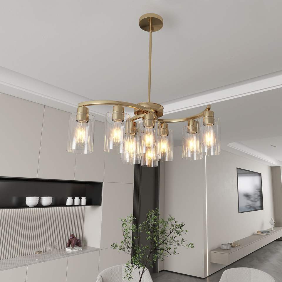 โคมไฟระย้าแก้วสีทองสไตล์ร่วมสมัยปรับความสูงได้ 9 ดวง สำหรับโต๊ะรับประทานอาหาร ชุดโคมไฟห้อย