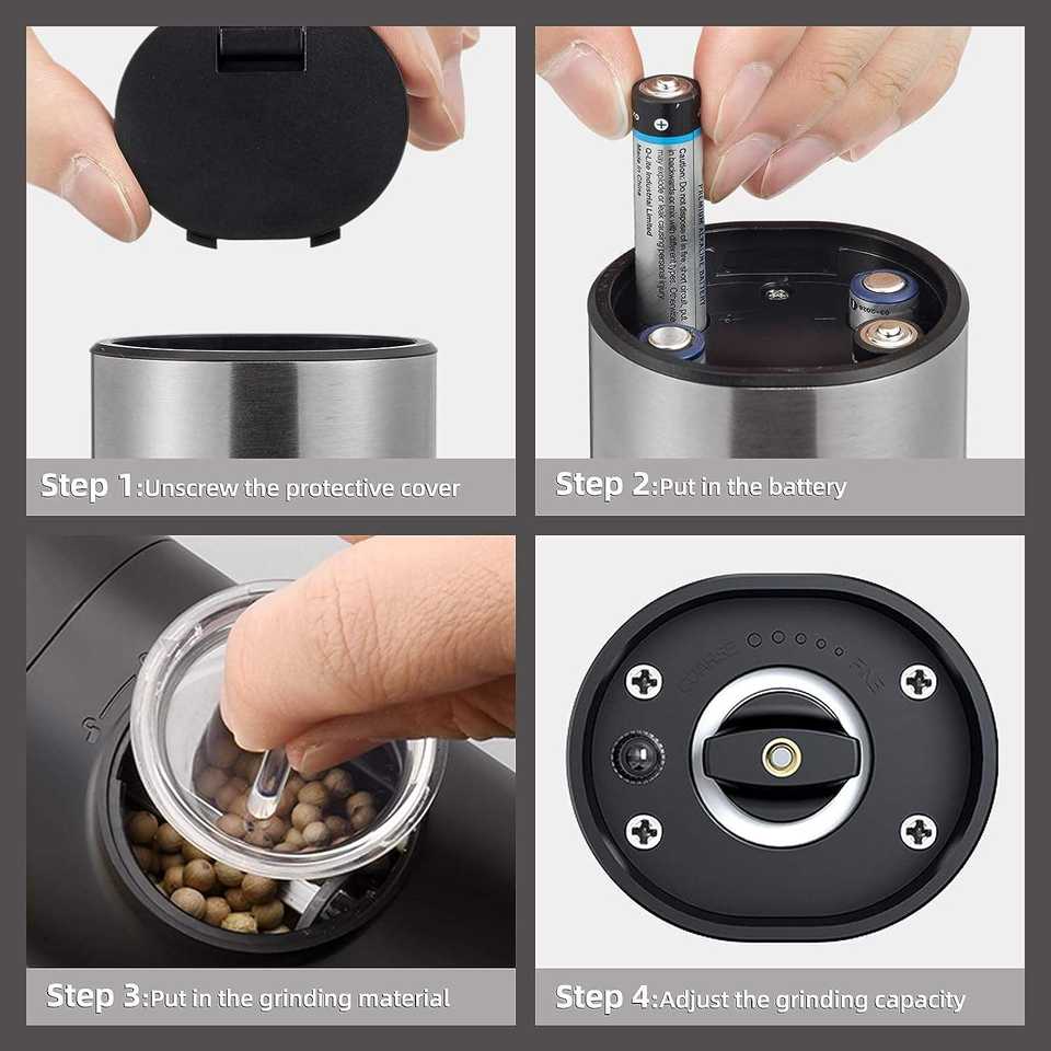 เครื่องบดพริกไทยไฟฟ้าแบบพกพาขนาดเล็ก ปรับระดับได้ ผลิตจากสแตนเลส เป็นมิตรกับสิ่งแวดล้อม ใช้แบตเตอรี่ ทำงานอัตโนมัติ ทำจากโลหะ