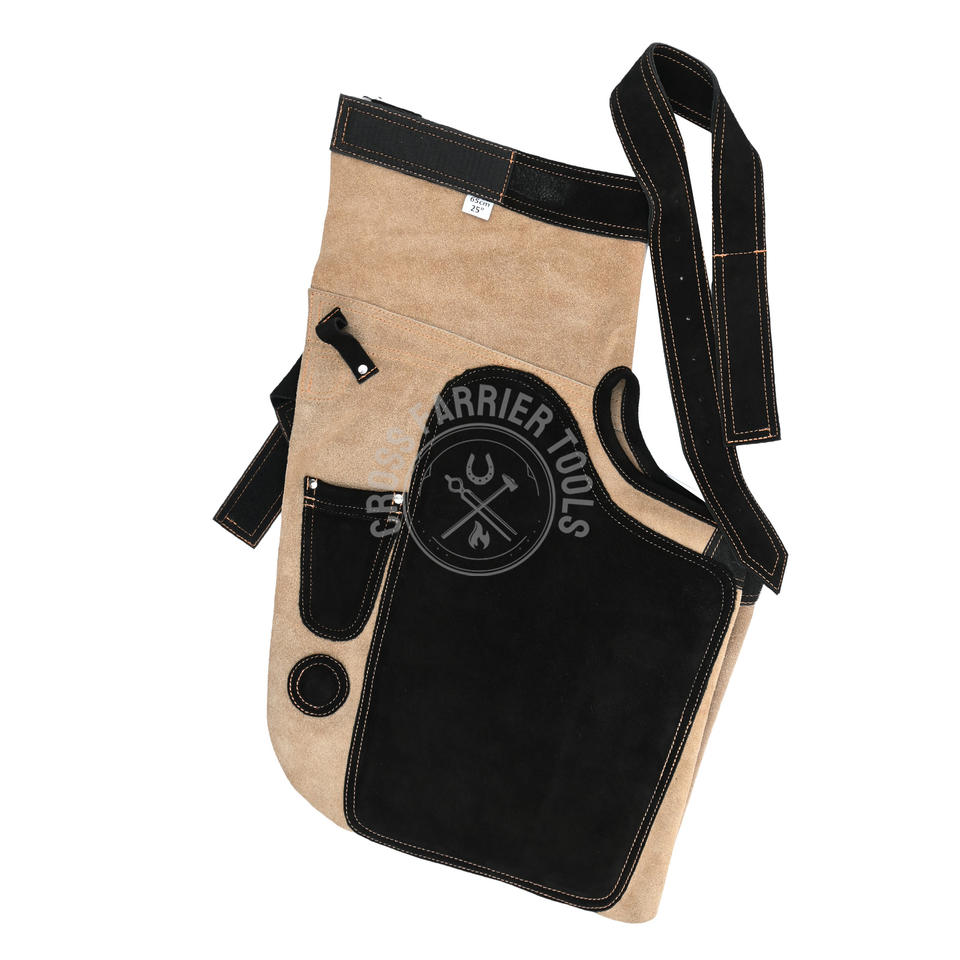 ผ้ากันเปื้อนช่างตัดแต่งกีบม้าแบบปรับได้ ทำจากหนัง สีดำและสีน้ำตาล มีช่องใส่มีด ที่ใส่ค้อน และแผ่นแม่เหล็กสำหรับเก็บตะปู