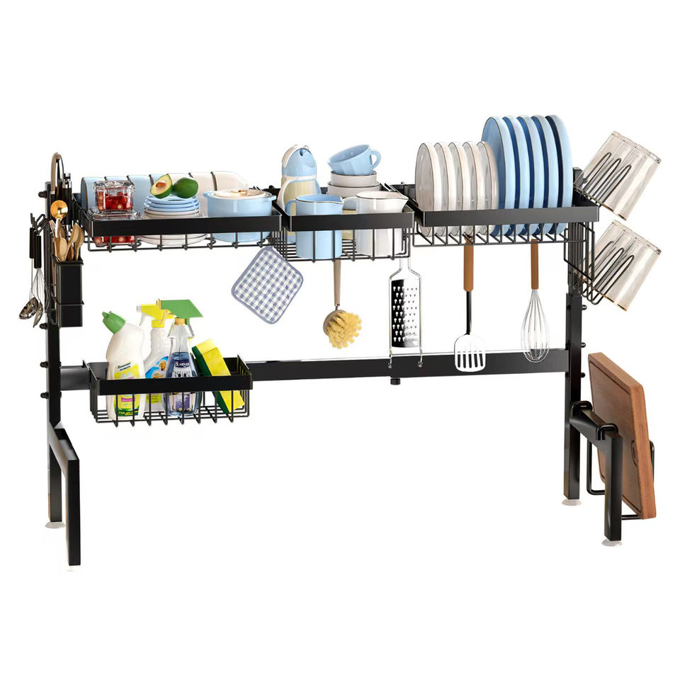 ที่คว่ำจานแบบปรับความยาวได้ชั้นวางของเหนือเคาน์เตอร์พร้อมบล็อกมีดและที่วางตะเกียบ