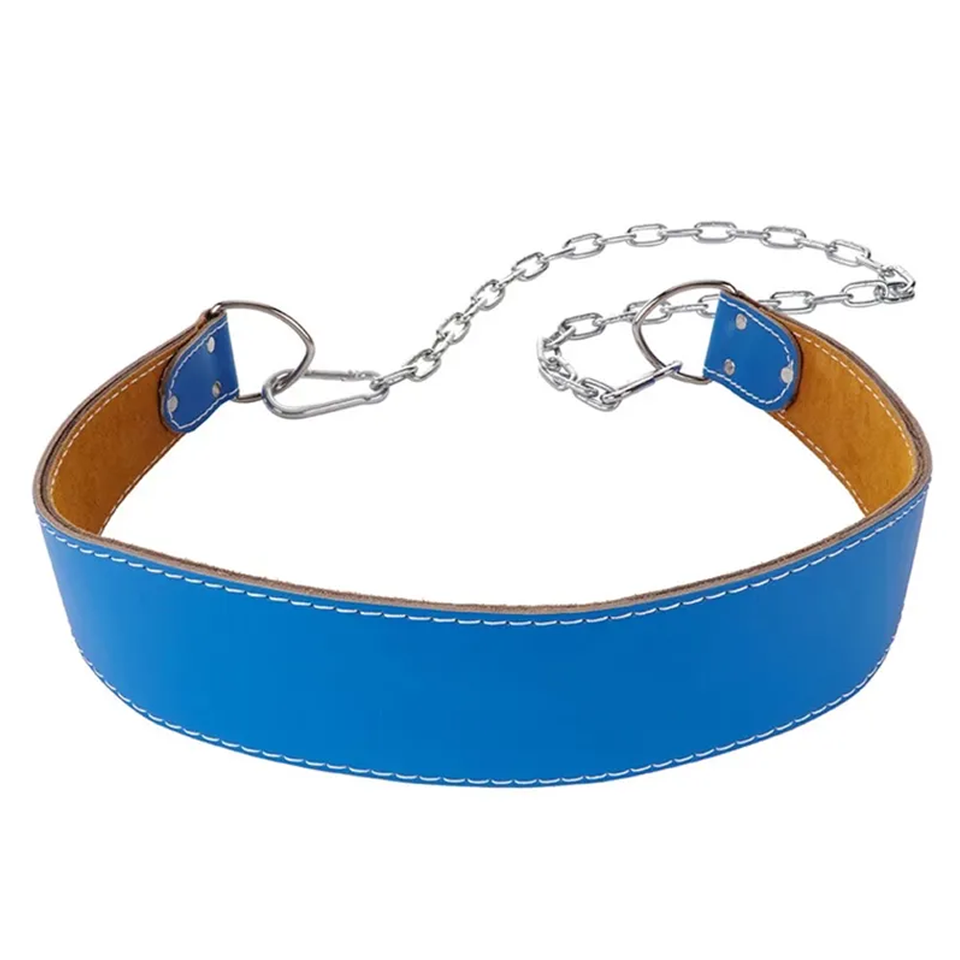 เข็มขัดหนังสีฟ้าสำหรับผู้ชายและผู้หญิงปรับได้สายโซ่โลหะสำหรับยิมฟิตเนสเข็มขัดจุ่มยกน้ำหนักคุณภาพสูง