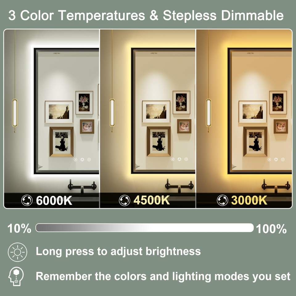 ไฟ LED ปรับระดับได้สำหรับห้องน้ำ รูปทรงสี่เหลี่ยมผืนผ้า แสงด้านหน้าและด้านหลัง 3000K/4500K/6000K ติดผนังแบบมีกรอบ ป้องกันฝ้า สำหรับโรงแรมทันสมัย