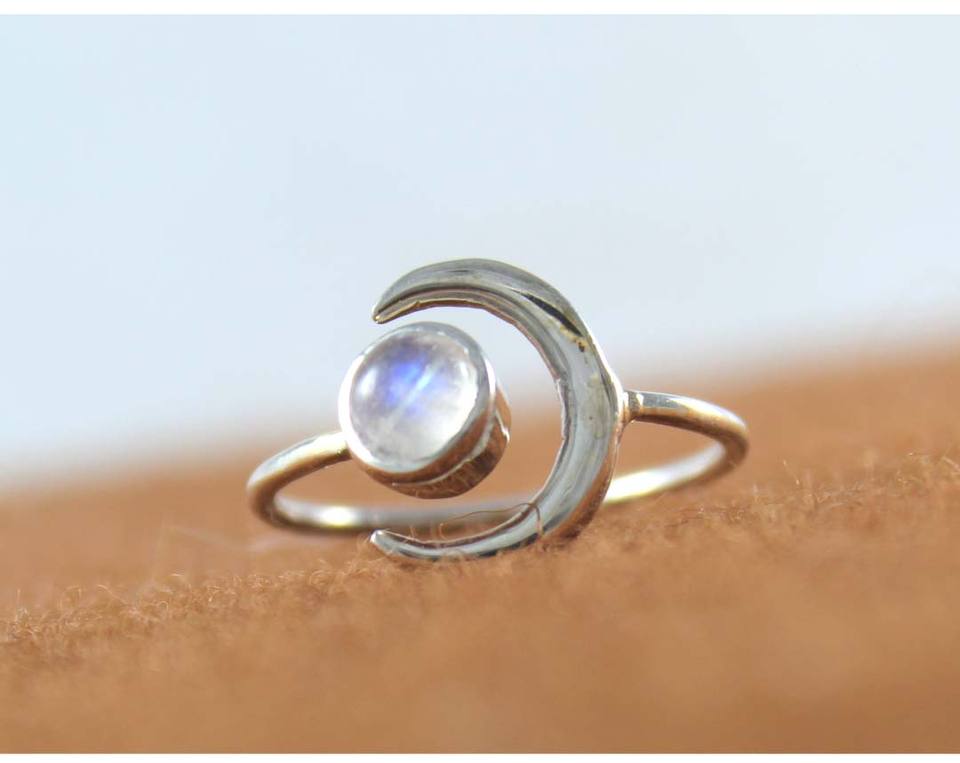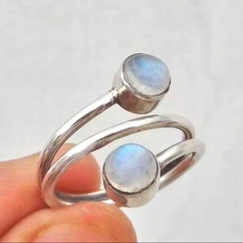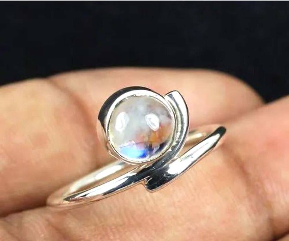 แหวนพลอยมูนสโตนสีรุ้งแบบปรับขนาดได้ขอบ8มม. ทรงกลมทำด้วยมือเงินแท้ของขวัญสำหรับงานแต่งงาน