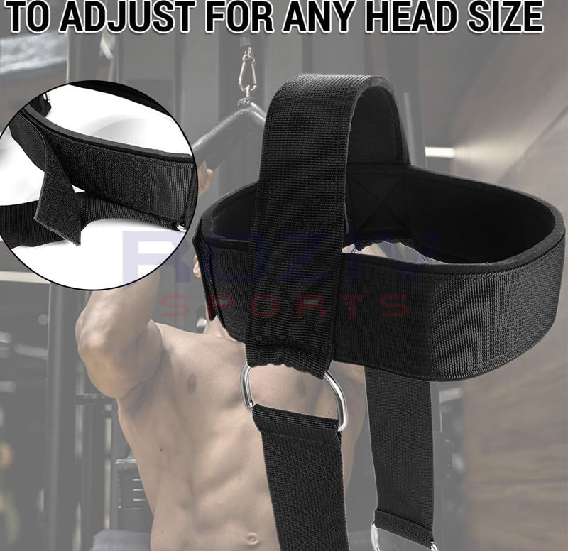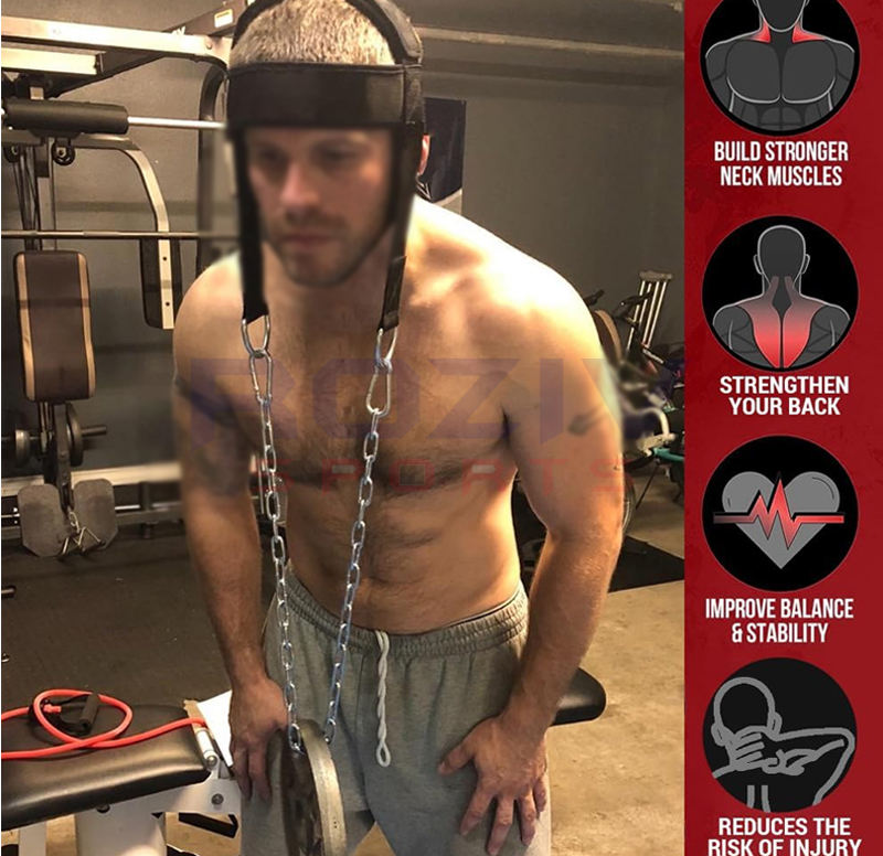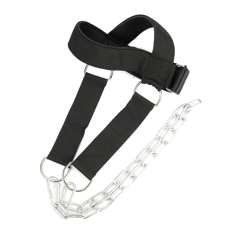 สายรัดคอและคางแบบปรับได้ บุด้วยนีโอพรีนอย่างนุ่ม พร้อมโซ่สำหรับออกกำลังกายคอและยกน้ำหนัก
