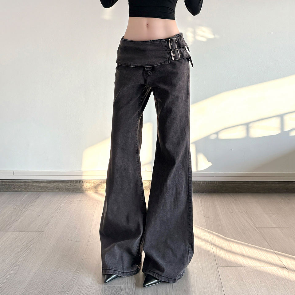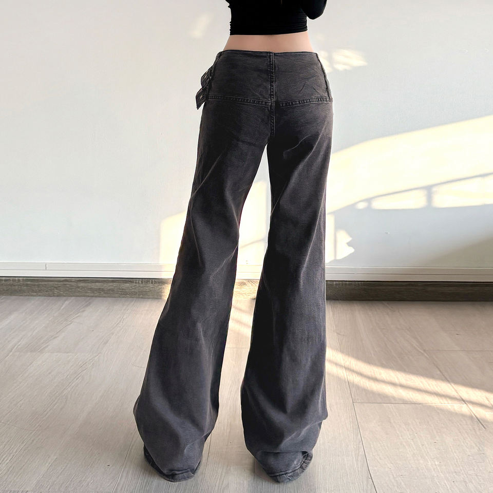 กางเกงยีนส์ทรงบานเอวสูงแบบสลิมฟิต แต่งห่วงโลหะปรับได้ สไตล์ย2เค ย้อนยุค สีเทาเข้ม ผ้ายืด