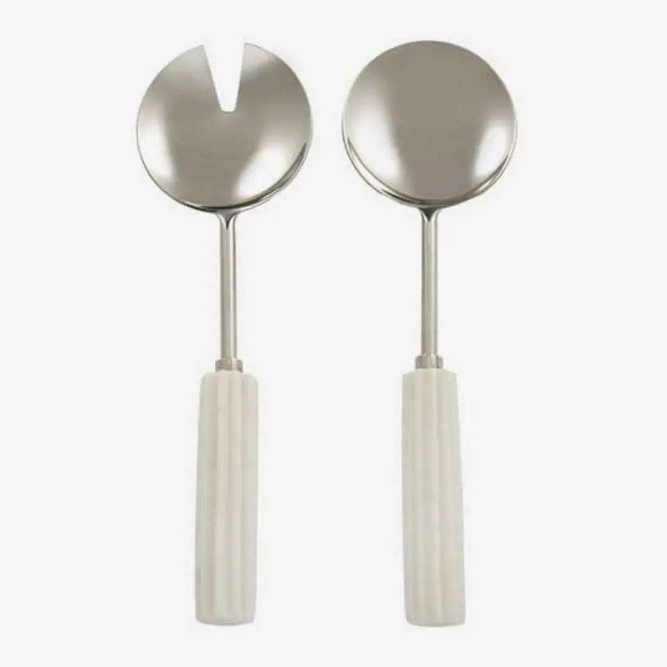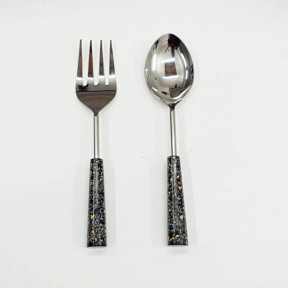 ช้อนและส้อมเสิร์ฟสลัดโลหะสีทอง ดีไซน์สวยงาม พร้อมด้ามจับเรซิ่นพิมพ์ลาย สำหรับชุดเสิร์ฟสลัดบนโต๊ะอาหาร