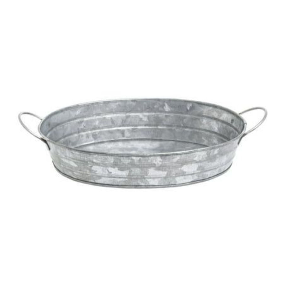ถาดเสิร์ฟโลหะชุบสังกะสีรูปวงรี ดีไซน์สวยงาม พร้อมหูจับ สำหรับใช้ในบ้าน ร้านอาหาร งานจัดเลี้ยง และงานอีเว้นท์ ในราคาที่เข้าถึงได้