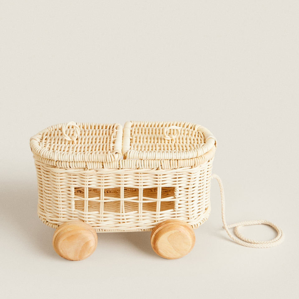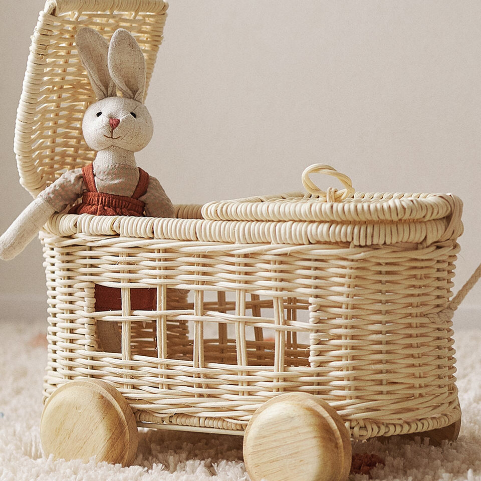รถเข็นของเล่นหวายสุดน่ารักและหรูหรา รถเข็นเด็กหวายธรรมชาติสำหรับห้องเด็ก ทำด้วยมือคุณภาพสูง รถเข็นเด็กหวาย