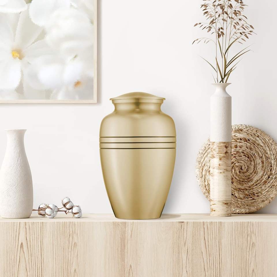 โกศที่ระลึกการเผาศพสําหรับผู้ใหญ่สําหรับเถ้ามนุษย์ทองที่มีแถบสีดําทองเหลืองโกศงานศพพร้อมถุงกํามะหยี่