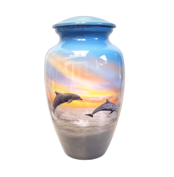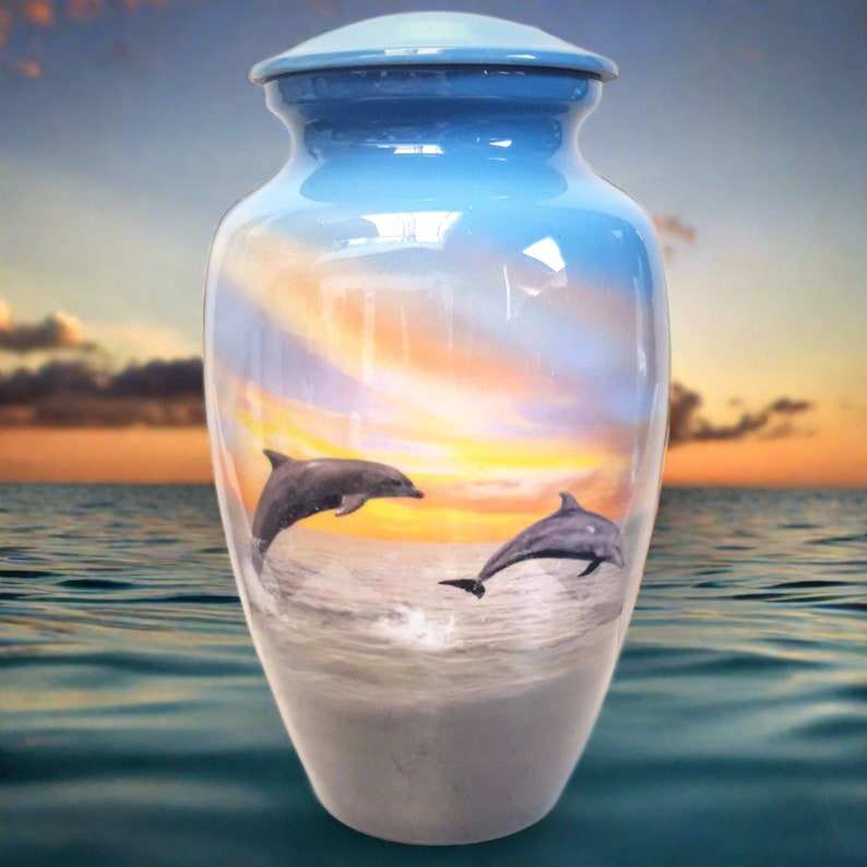 โกศบรรจุอัฐิสำหรับผู้ใหญ่ ลายปลาโลมาขี้เล่น แนวชายหาดและมหาสมุทร โกศอะลูมิเนียมสำหรับงานศพ