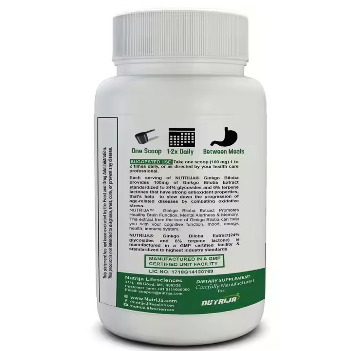 สารสกัดใบแปะก๊วยสำหรับผู้ใหญ่ NutriJa ได้รับการรับรองมาตรฐาน GMP ขนาด 50 กรัม ชนิดผง ประสิทธิภาพ 24/6 อายุการเก็บรักษา 24 เดือน อาหารเสริมเพิ่มพลังงานสำหรับการเล่นกีฬา