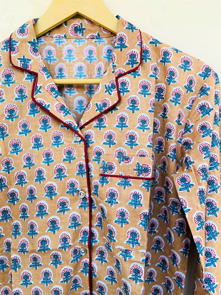 ชุดนอนผ้าฝ้ายแท้100% อินเดียสำหรับผู้ใหญ่ชุดนอนพิมพ์ลายดอกไม้สวมใส่สบายระบายอากาศได้ดีสำหรับทุกฤดูกาล