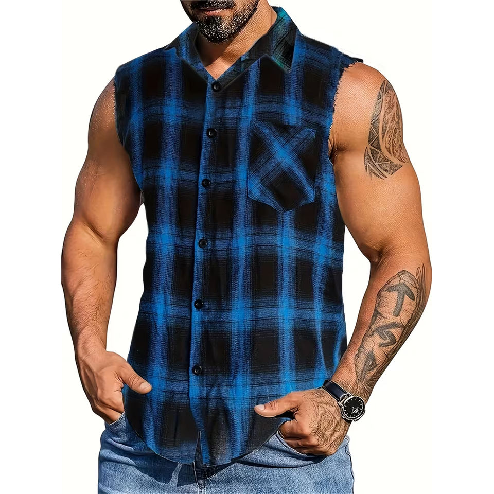 เสื้อเชิ้ตแขนกุดผ้าแฟลนเนลลำลองสำหรับผู้ชายวัยผู้ใหญ่ ลายสก็อตแบบวินเทจ ผ้าฟลีซพอดีตัว ไซส์พลัส แฟชั่นเสื้อเชิ้ตผ้าฝ้ายแฟลนเนล