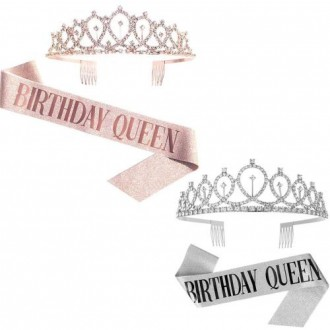 Adult Pink Gold Silver Queen Tiara Crown Shoulder Strap Set for Birthday Party Decorations and Supplies