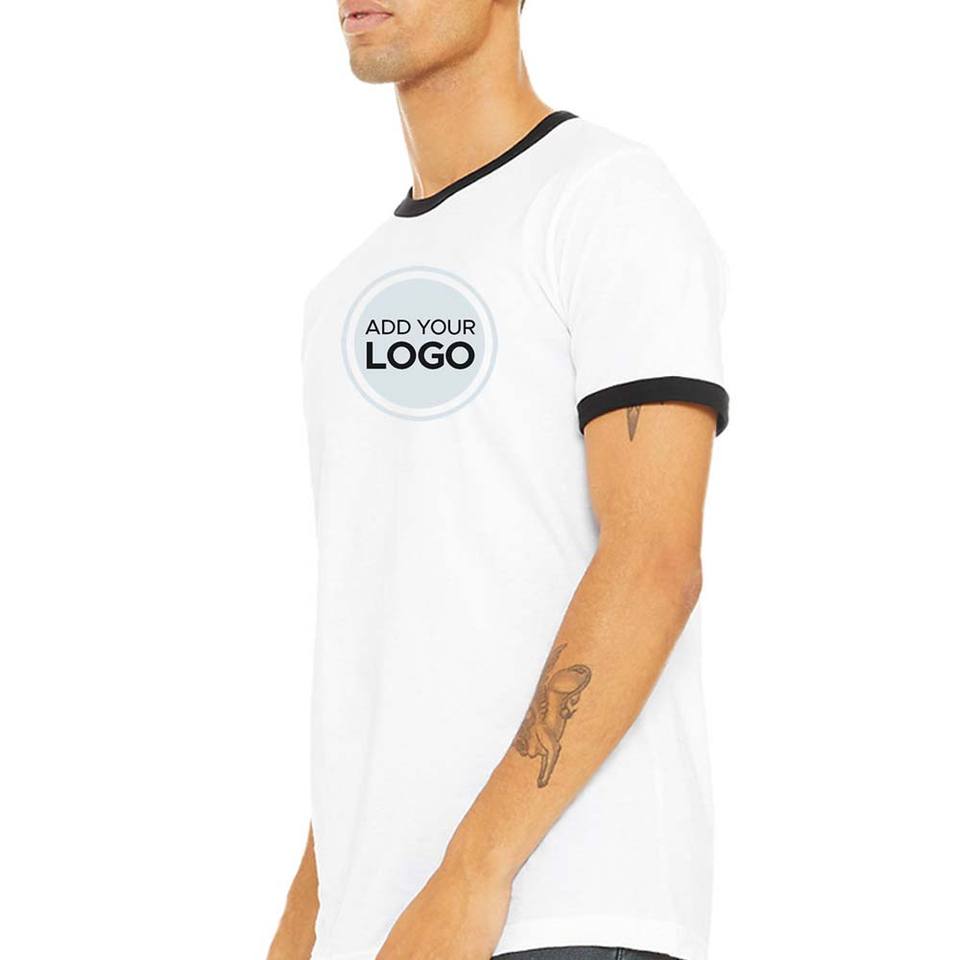 เสื้อยืดริงเกอร์สำหรับผู้ใหญ่เสื้อยืดพิมพ์ลายหน้าและหลังแบบกำหนดเองเสื้อยืดผ้าใบเบลล่าขนาดใหญ่