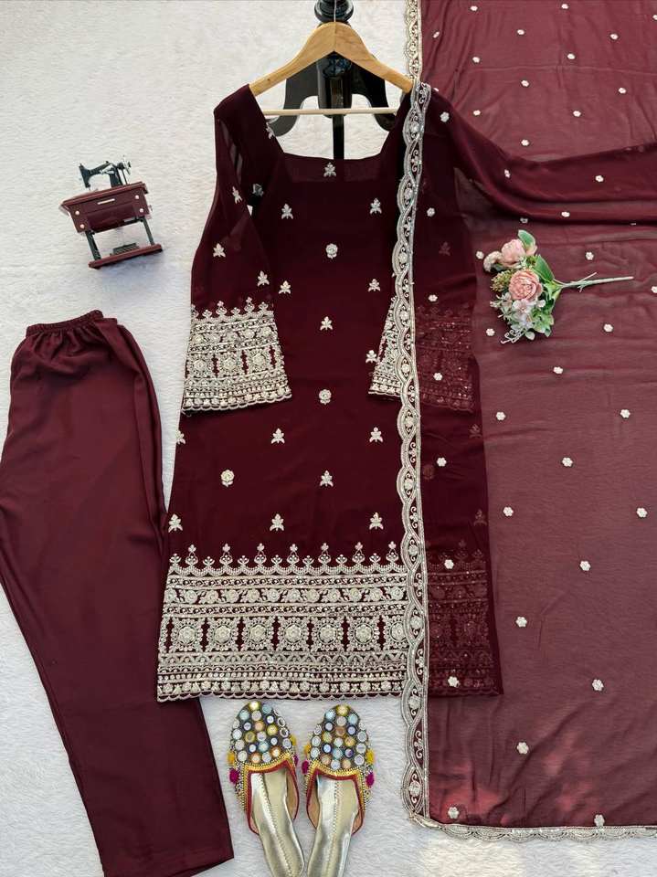 ชุดคุर्ติผ้าจอร์เจตต์ปักลายสำหรับผู้ใหญ่ พร้อมกางเกงมีกระเป๋าและผ้าคลุมไหล่ ชุด 3 ชิ้น สไตล์อินเดีย-ปากีสถาน สำหรับงานปาร์ตี้
