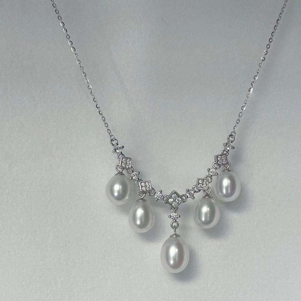 จี้ไข่มุกน้ำจืดทรงหยดน้ำสไตล์บาโรกสุดหรู สร้อยคอวินเทจสไตล์พระราชวัง ไข่มุกออโรร่ารูปทรงข้าว พร้อมโซ่เงินแท้ S925