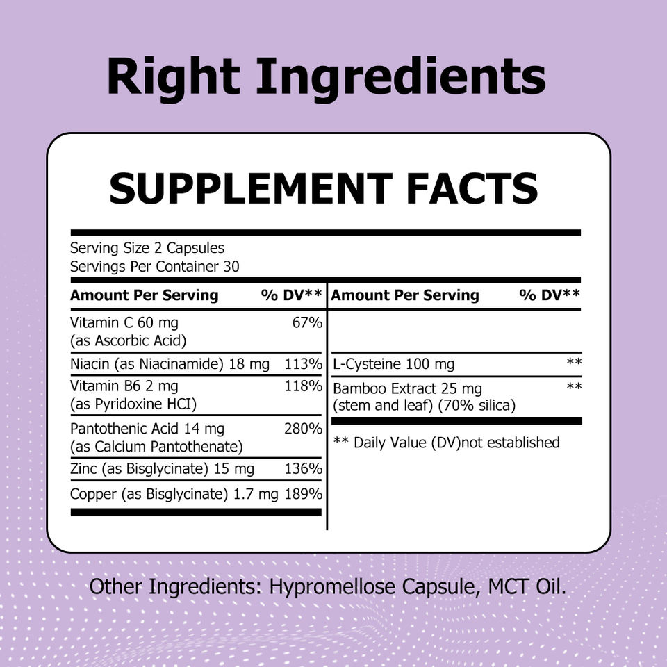 เคราติน คอมเพล็กซ์, วิตามินซี, ไนอะซิน, วิตามินบี 6, กรดแพนโทธีนิก, สังกะสี, ทองแดง, แอล-ซิสเทอีน