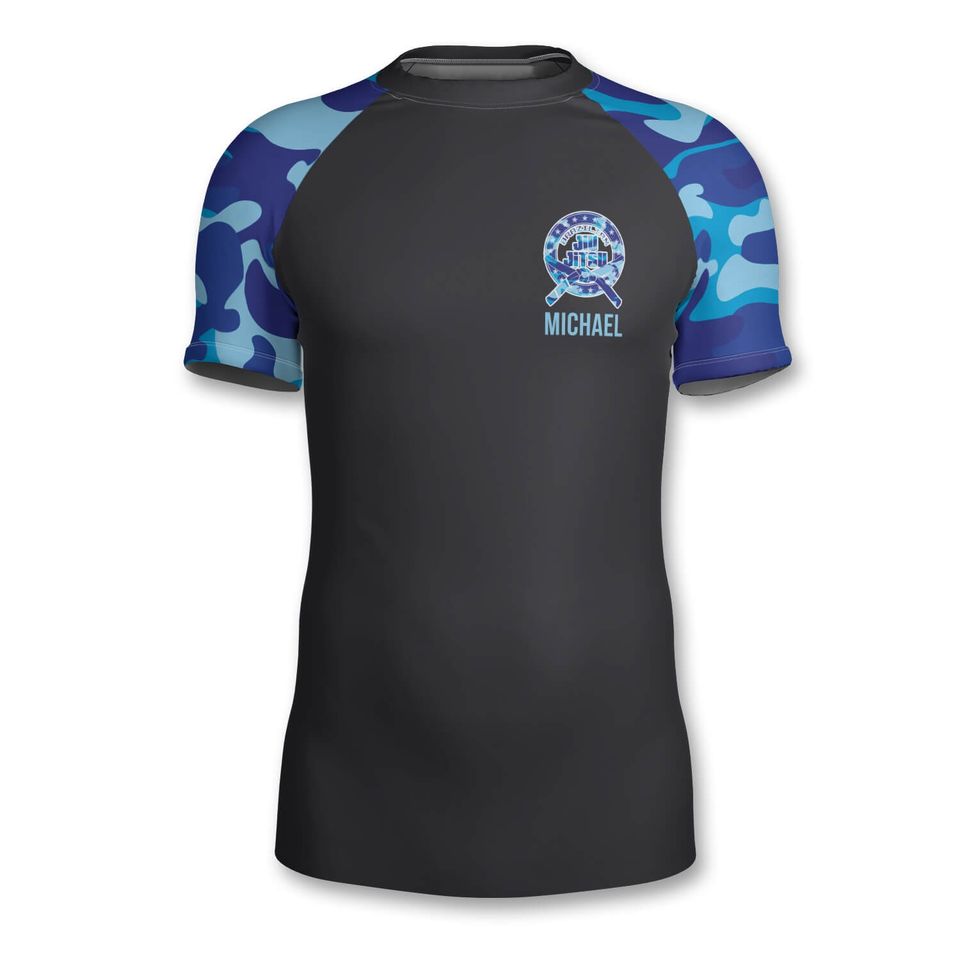 เสื้อแรชการ์ดแขนสั้นสำหรับเล่นกีฬาขั้นสูงเข้ารูปแบบรัดรูปแห้งเร็วเทคโนโลยีออกแบบมาสำหรับนักกีฬาที่มีความทนทานและเล่นกีฬา