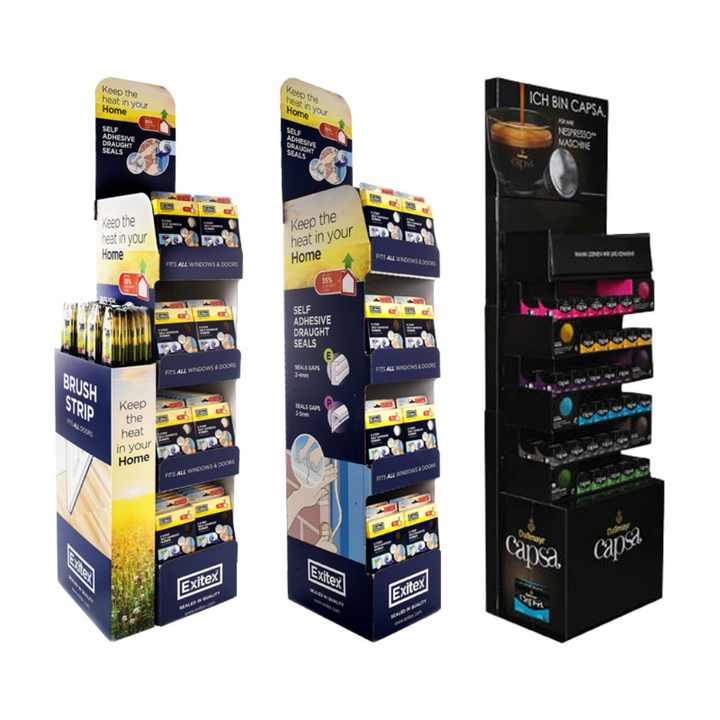 ชั้นวางสินค้าแบบตั้งพื้นทำจากกระดาษลูกฟูกสำหรับขนมขบเคี้ยวมันฝรั่งทอด พร้อมบริการออกแบบตามสั่งสำหรับจุดขายปลีก