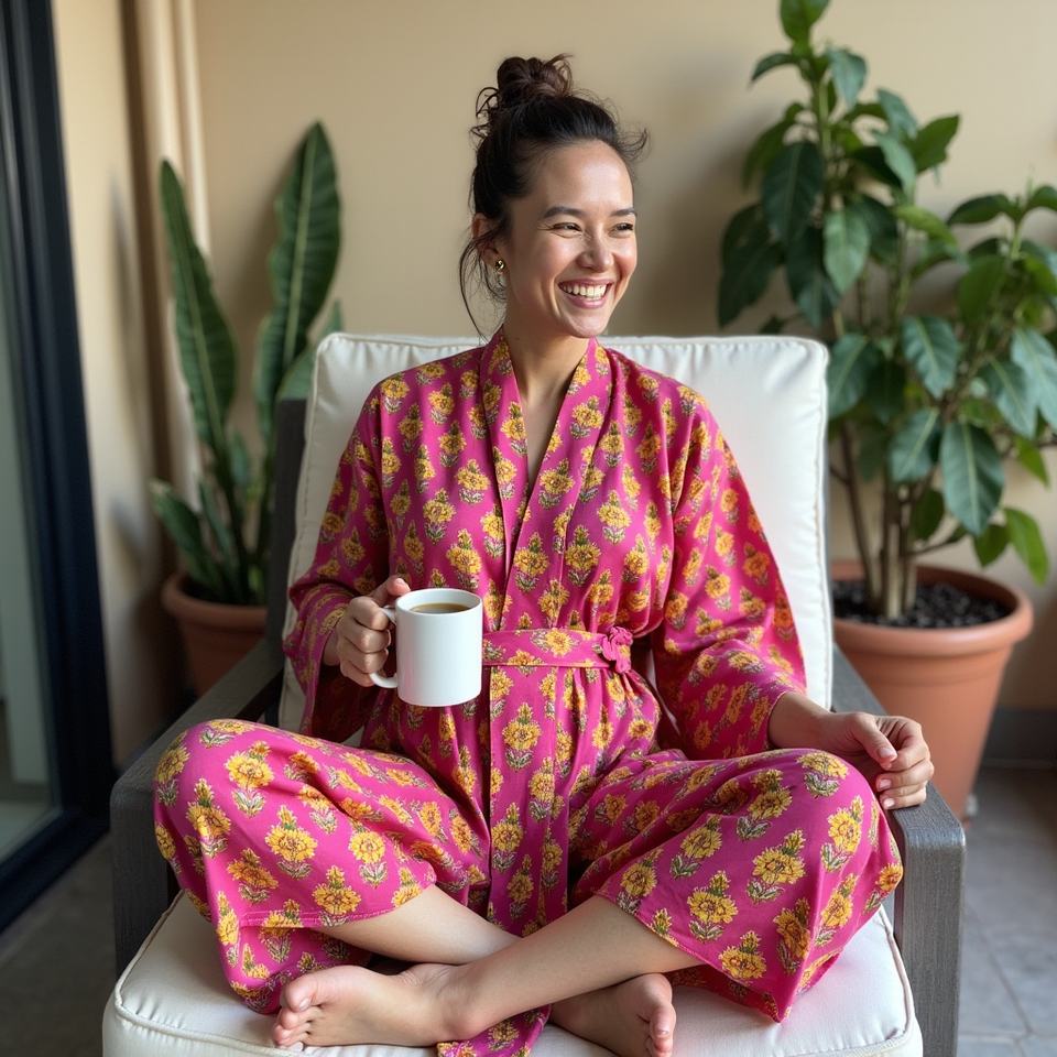 ชุดกิโมโนผ้าฝ้ายแท้สีชมพูบานเย็นพิมพ์ลายบูติสีเหลืองด้วยมือ ขนาดพลัสไซส์สำหรับผู้หญิง จากอินเดีย ยี่ห้อ Adya International
