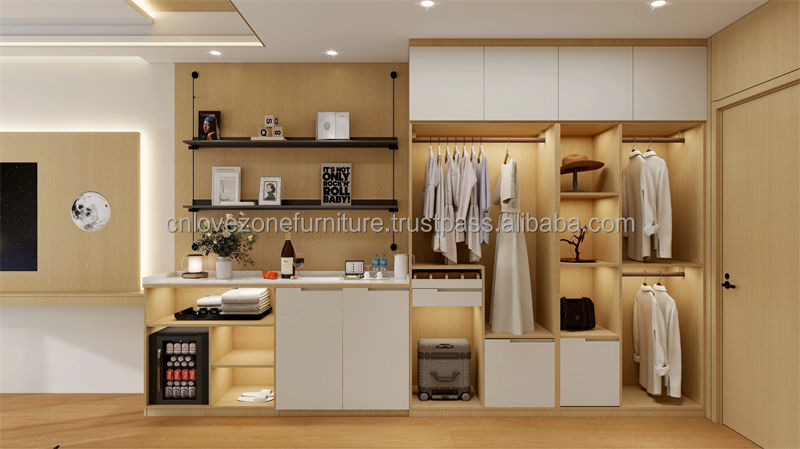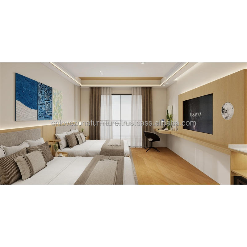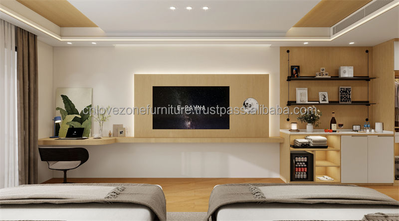 ชุดเฟอร์นิเจอร์ห้องนอนแบบโมดูลาร์ราคาประหยัดสำหรับโรงแรม 3 ดาว โครงเตียงไม้พร้อมโต๊ะข้างเตียง ตู้เสื้อผ้า ตู้วางทีวี สำหรับห้องพักโรงแรมครบชุด