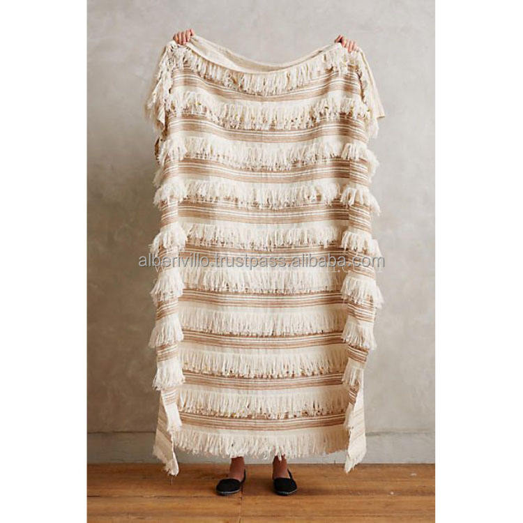 ผ้าห่มทอแบบโบฮีเมียนราคาไม่แพงพร้อมพู่ห้อยสำหรับโซฟา เตียง ของตกแต่งบ้าน ผ้าห่มและผ้าคลุม คอลเลคชั่นสวยงาม ผลิตในอินเดีย