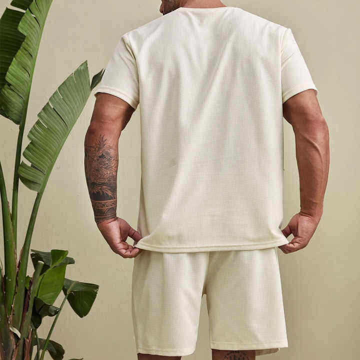 ชุดเสื้อยืดและกางเกงขาสั้นผ้าวาฟเฟิลถักขนาดพิเศษสำหรับผู้ชายโลโก้ตามสั่ง