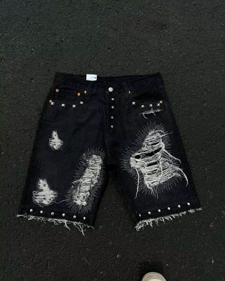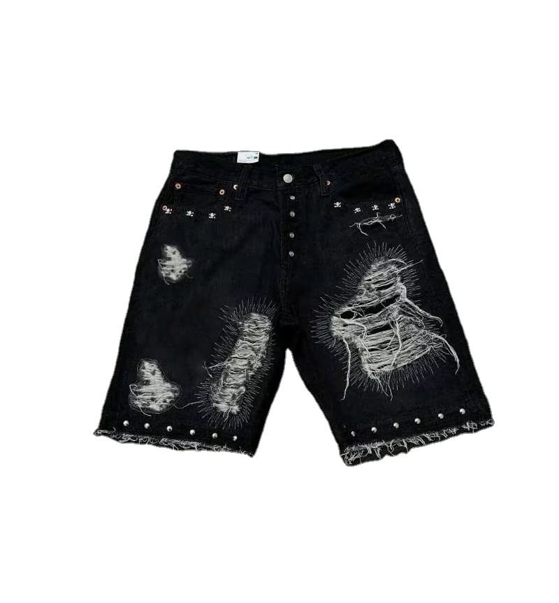 กางเกงยีนส์ขาสั้นทรงโอเวอร์ไซส์สีดำขาดๆ ราคาประหยัด สไตล์สตรีทแวร์ Y2K แต่งคริสตัล ล้างสีพิเศษ