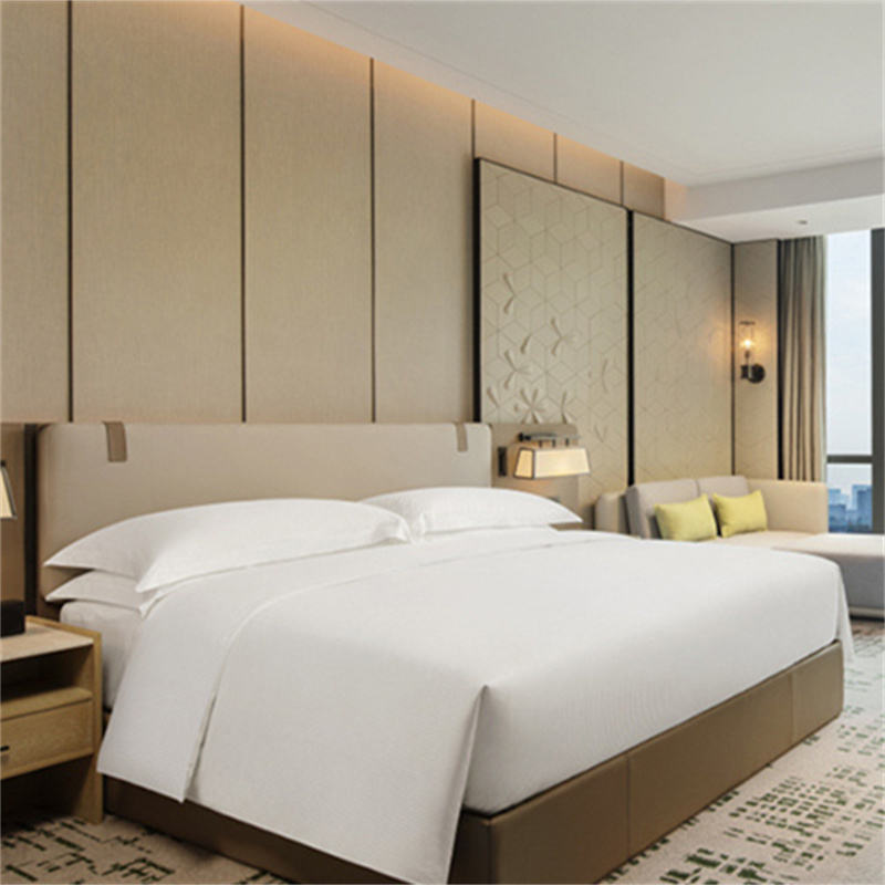 เตียงและหัวเตียงหุ้มเบาะไม้ราคาไม่แพงสำหรับชุดเฟอร์นิเจอร์ห้องนอนโรงแรมพร้อมชุดที่นอนและโต๊ะข้างเตียง