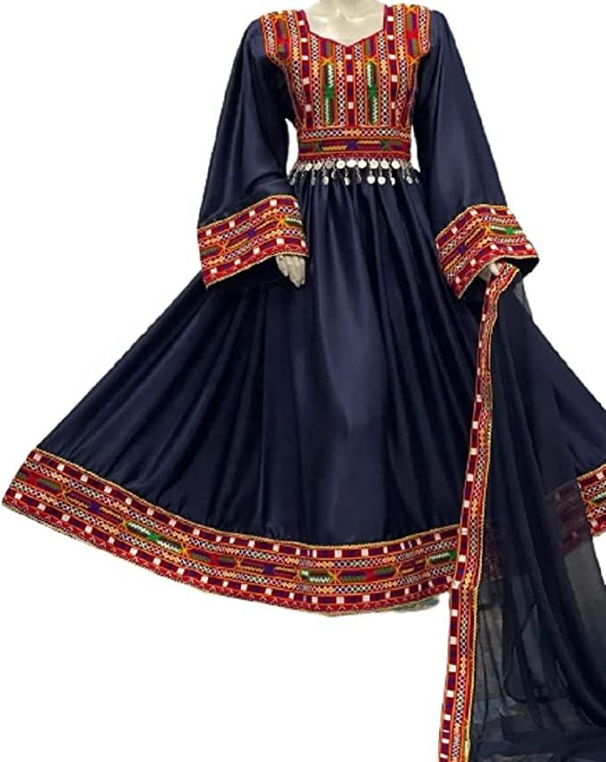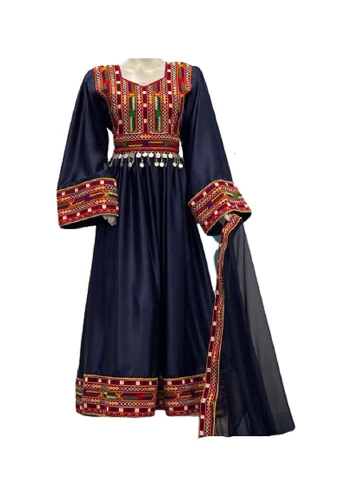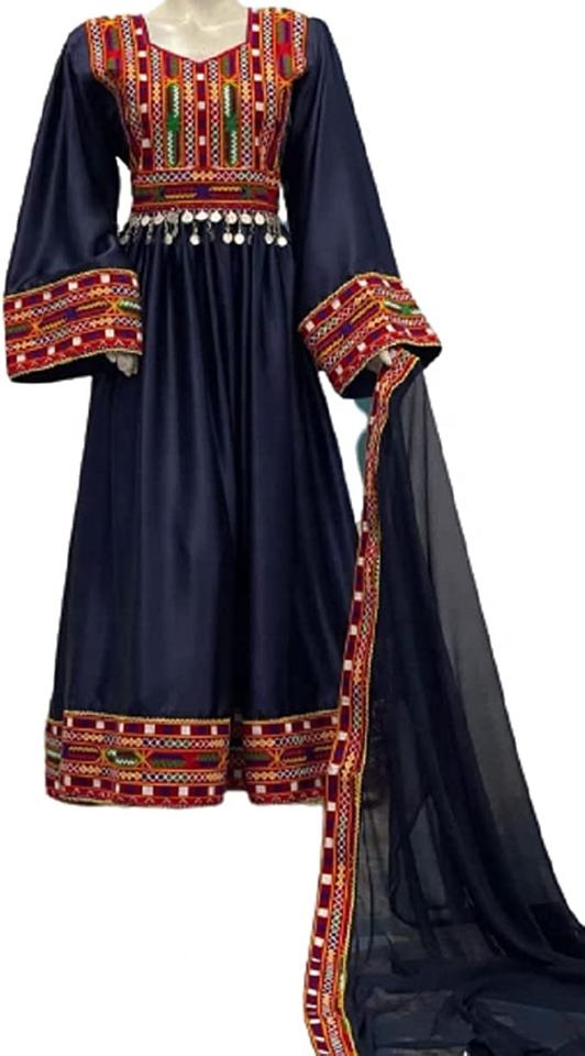 ชุดเดรส/เสื้อผ้าทำมือแบบอัฟกันโคจิ ปักลายเต็มตัว งานฝีมือแบบดั้งเดิมของชาวอัฟกานิสถาน วัฒนธรรมชาวปัชตุน สีดำ สำหรับงานแต่งงาน ขนาดกลาง