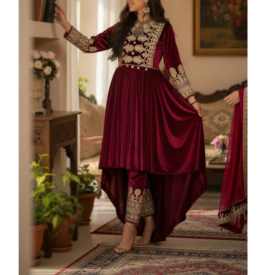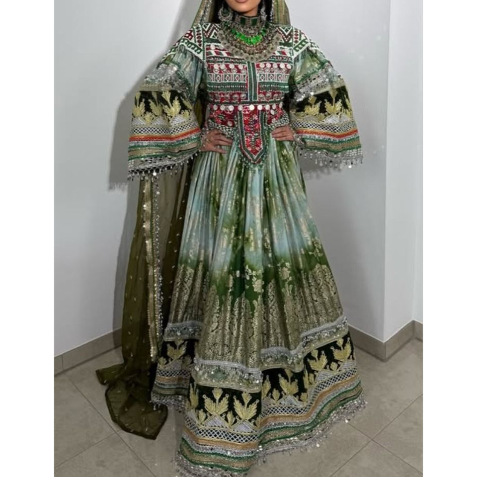 ชุดเดรสยาวแบบดั้งเดิมของผู้หญิงอัฟกานิสถาน พร้อมงานปักลายสีสันสดใสตามวัฒนธรรม