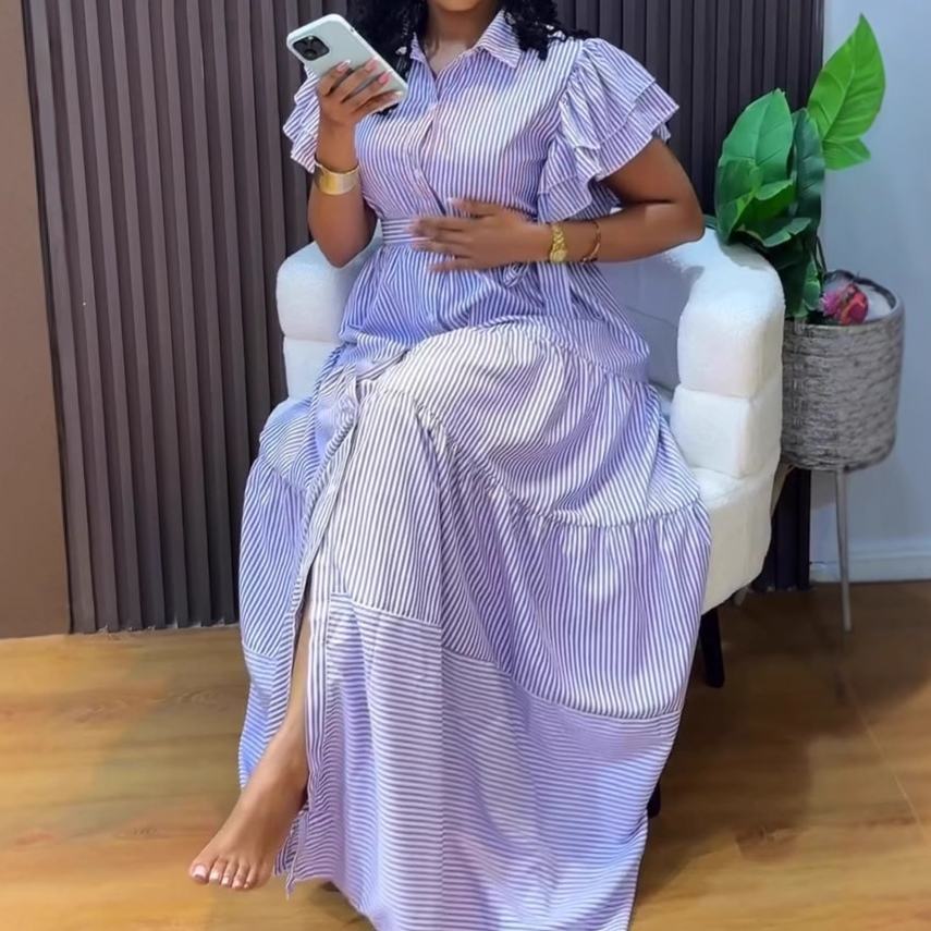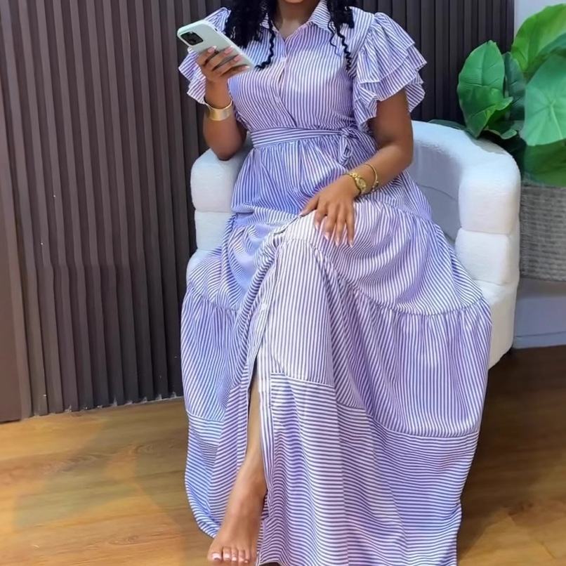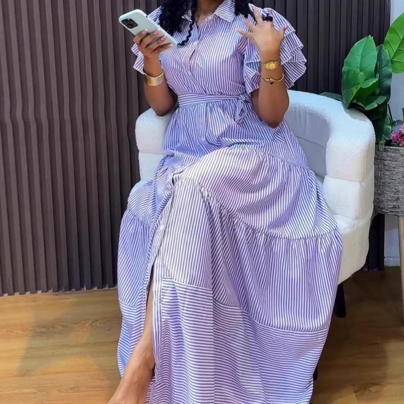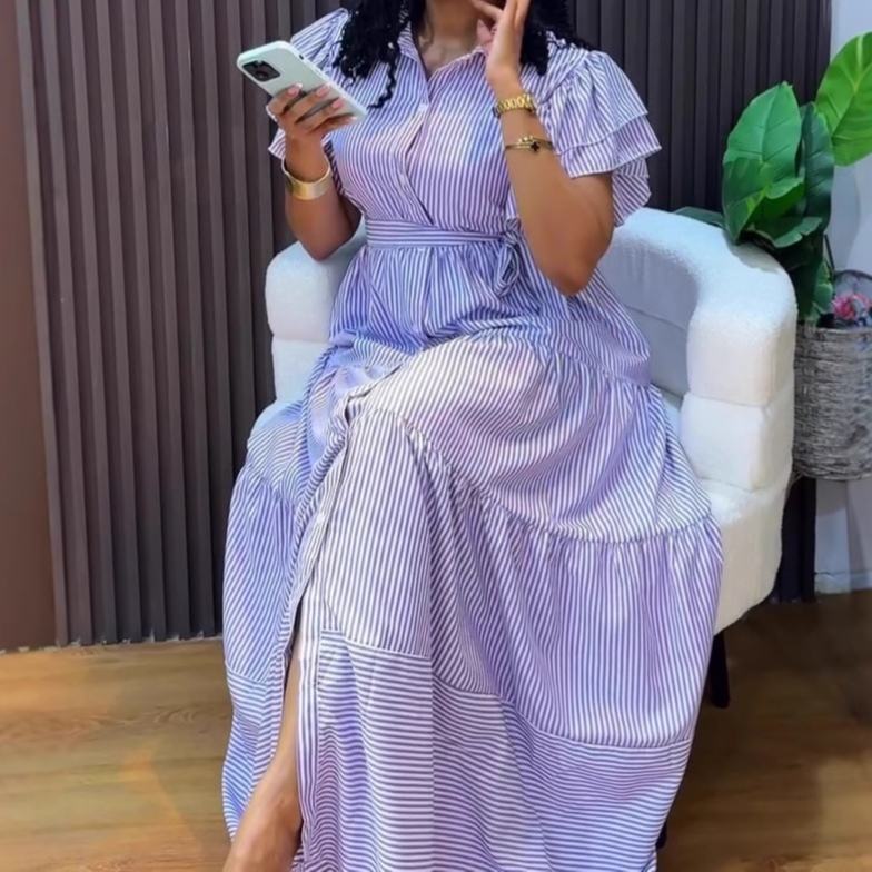 ชุดเดรสแฟชั่นลายทางแขนสั้นทรงหลวมความยาวปานกลางสำหรับผู้หญิงพลัสไซส์ชาวแอฟริกัน