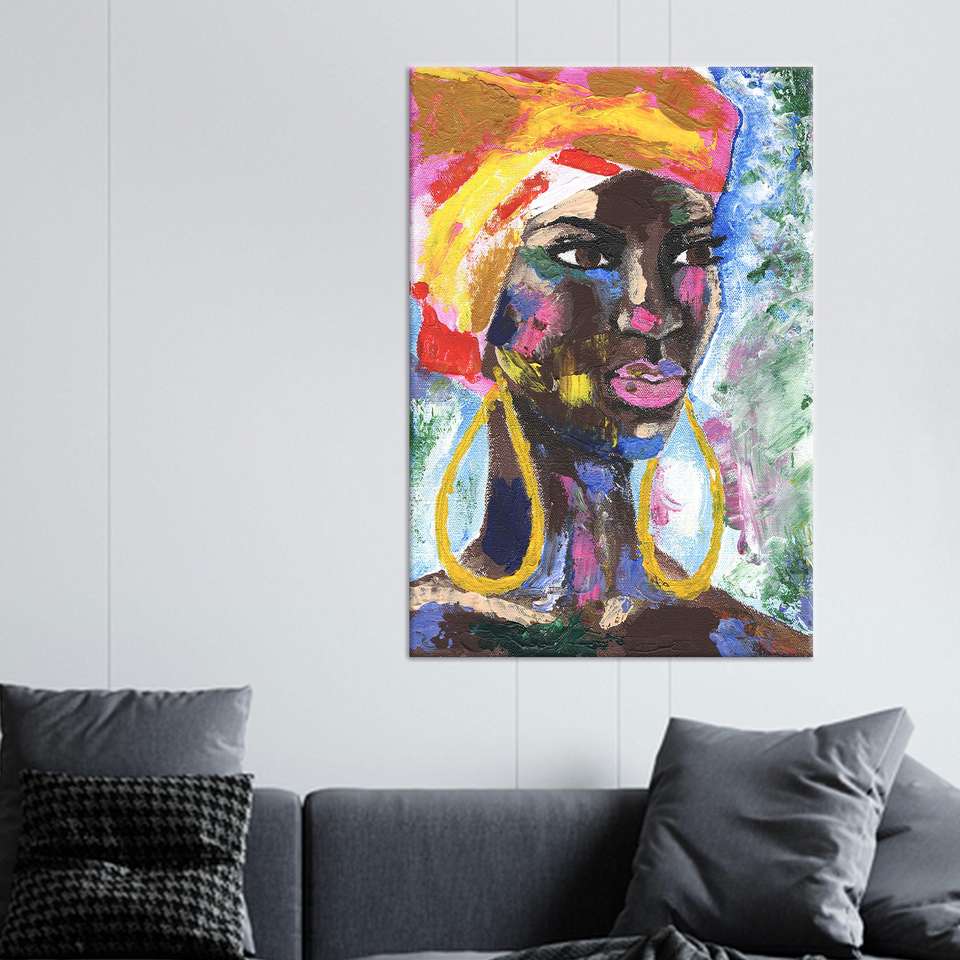 ภาพวาดผู้หญิงแอฟริกันบนผ้าใบ: ภาพเหมือนแนวเอ็กเพรสชันนิสม์ที่โดดเด่น ตกแต่งสไตล์แอฟโฟรที่มีชีวิตชีวา ผ้าใบหุ้ม