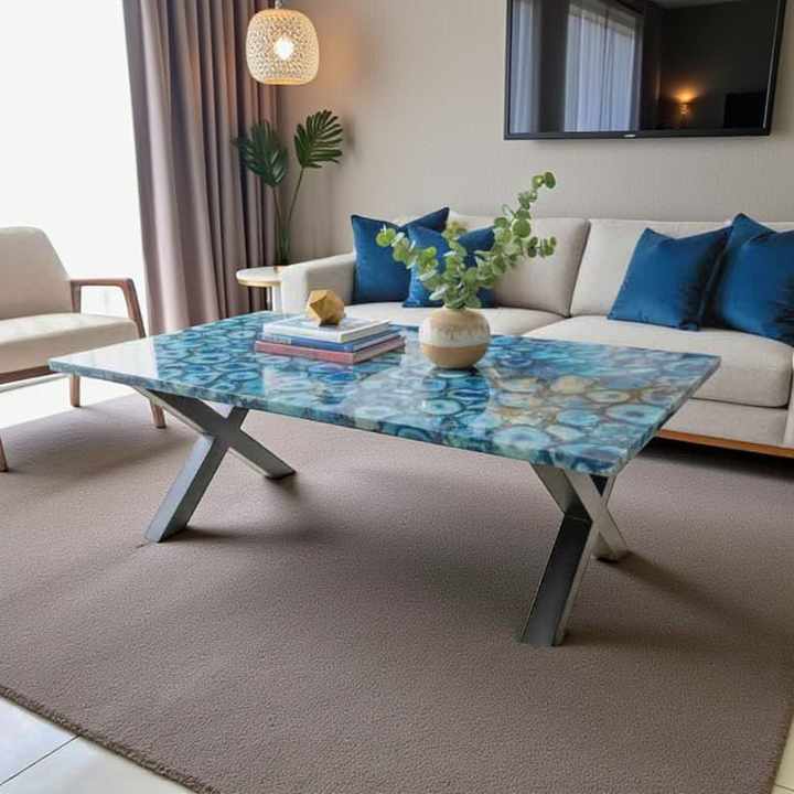 โต๊ะรับประทานอาหารแบบต่อขยายสีฟ้าอาเกตชุดรับประทานอาหารสุดหรูลายผีเสื้อหรูหราวัสดุหินใช้ในสำนักงาน