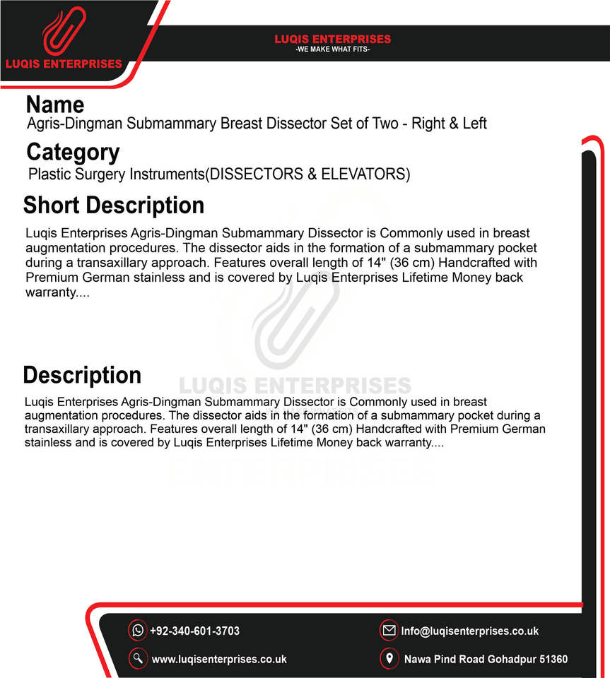 ชุดเครื่องมือผ่าตัดเต้านม Agris Dingman Submammary Breast Dissector จำนวนสองชิ้น ขวาและซ้าย ทำจากเหล็กกล้าไร้สนิมเกรดทางการแพทย์