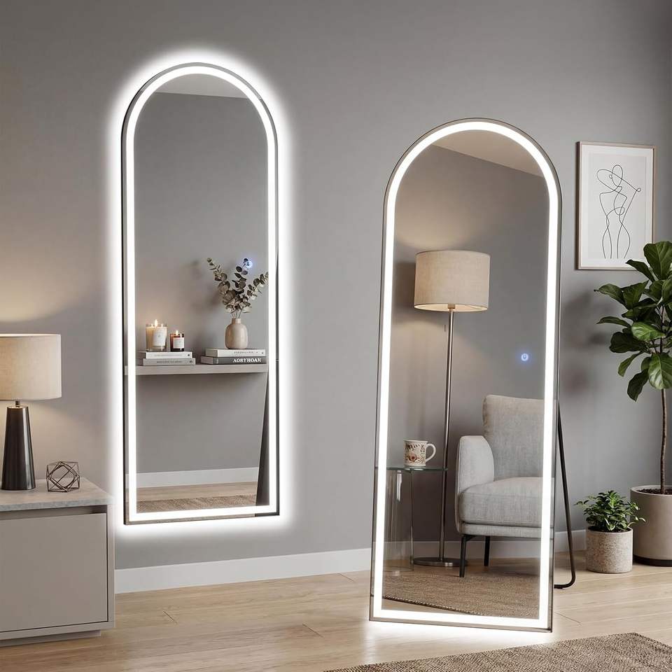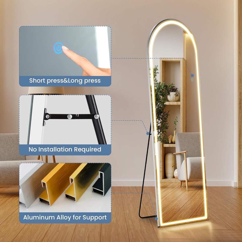 กระจกเงาเต็มตัว Aidoly รุ่น 6034L X 1634W ทรงโค้ง พร้อมไฟ LED กระจกนิรภัยแบบลอยตัว ตั้งพื้น ใช้ในบ้าน ดีไซน์มินิมอล