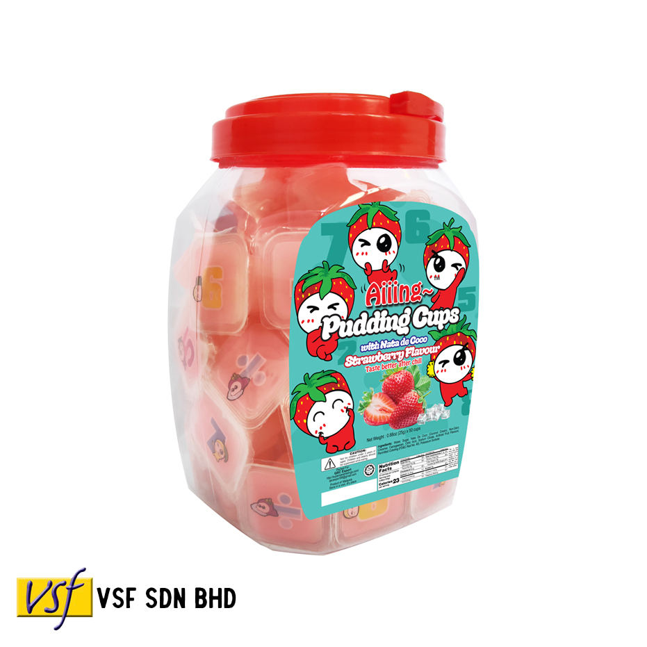 ถ้วยพุดดิ้งผลไม้ขนาดเล็ก Aiiing พร้อมสตรอเบอร์รี่รส Nata de Coco ขนาด25กรัม X 50ชิ้น X 6กระปุกผลิตในมาเลเซียฮาลาล