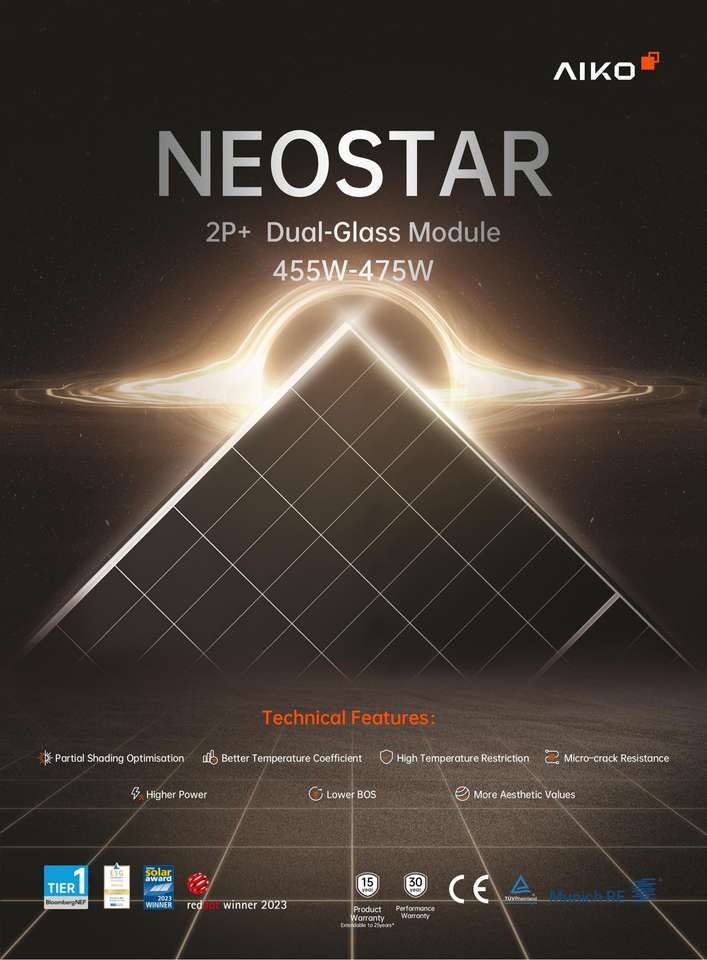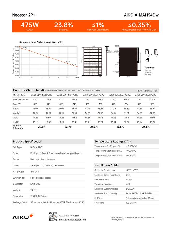 แผงโซลาร์เซลล์ Aiko ABC Pv Module Photovoltaic Panels แบบ N Type ABC Dual Glass Module PV Panel 455W 460W 465W 470W 475W AIKO รุ่น MAH54Dw