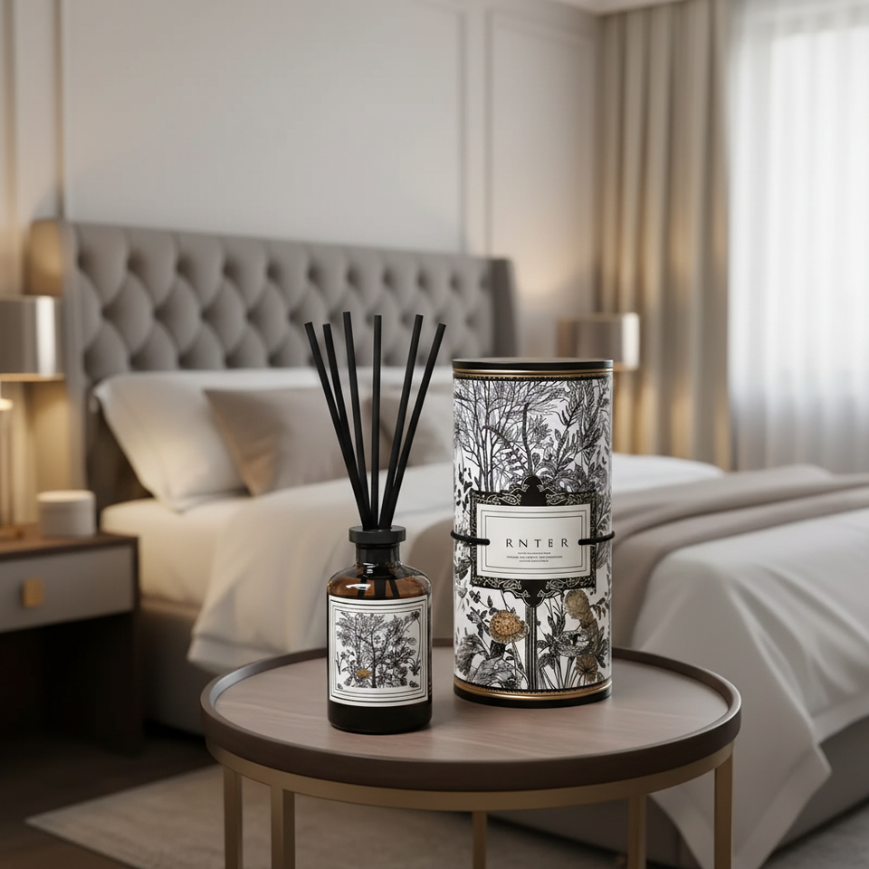 น้ำหอมปรับอากาศแบบก้านไม้หอม กลิ่นอัมเบอร์ ลายพฤกษศาสตร์ ยี่ห้อ Aikun Classic OEM บรรจุในขวดแก้วสีอำพัน พร้อมกล่องของขวัญสุดหรู สำหรับสร้างบรรยากาศหอมสดชื่นในบ้าน