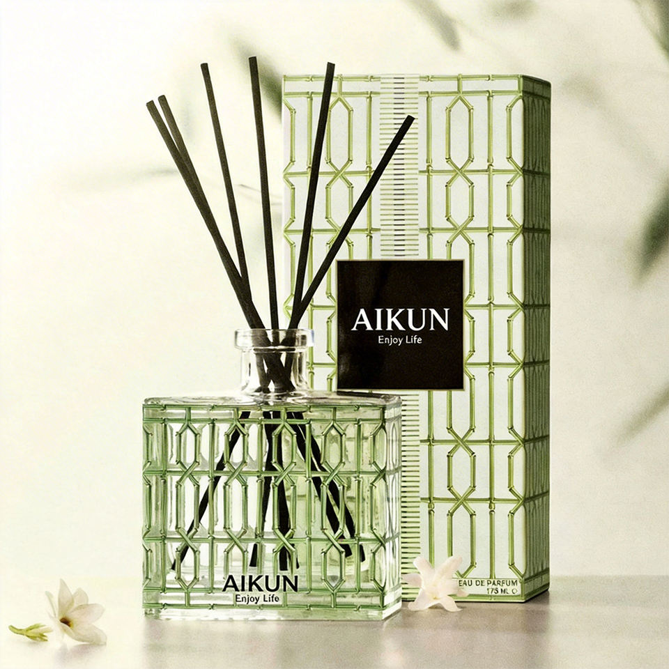 ขวดแก้วสี Aikun ลายหรูหรา กล่องของขวัญสุดพรีเมียม สูตร MMB ขนาด 175 มล. ชุดน้ำหอมปรับอากาศแบบก้านไม้หอม สำหรับตกแต่งบ้าน ขายส่ง