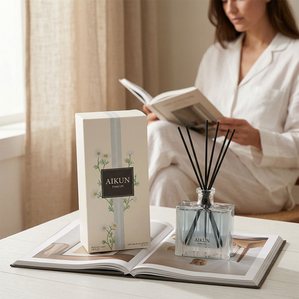ขวดใสทรงสี่เหลี่ยม Aikun บรรจุภัณฑ์แบบกำหนดเอง สูตร IP16 กลิ่นดอกไม้สดชื่น 150 มล. ชุดน้ำหอมกระจายกลิ่นแบบก้านไม้หอม สำหรับการอ่านหนังสือ