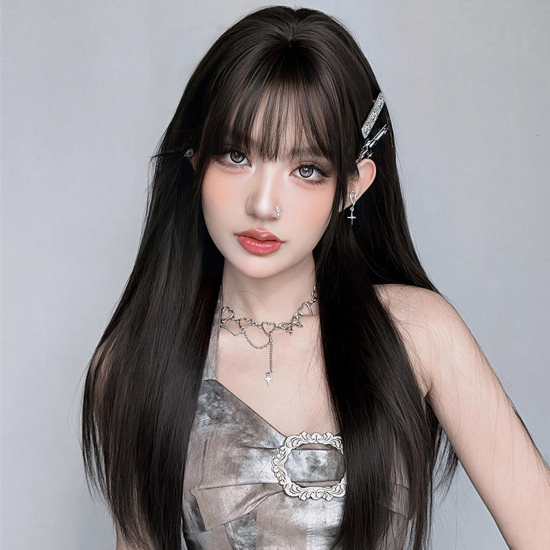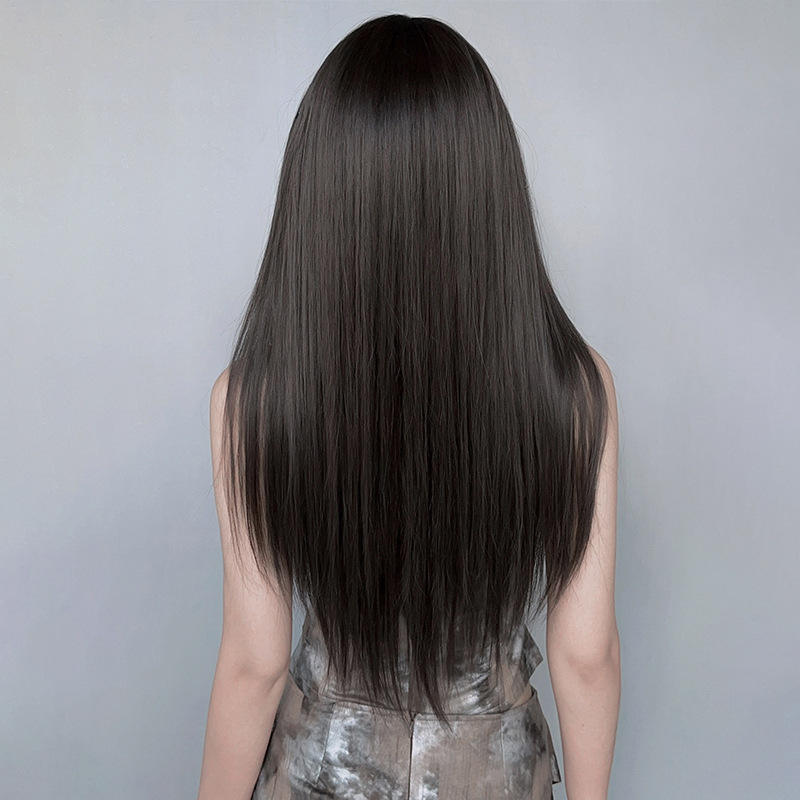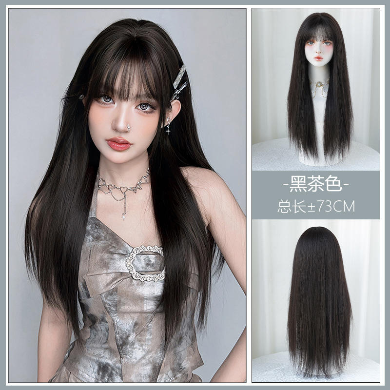 Ainizi New Design Korean Style 73cm Long Straight Black Tea Color No Cut None Lace Matte Synthetic Hair Wigs with Bangs