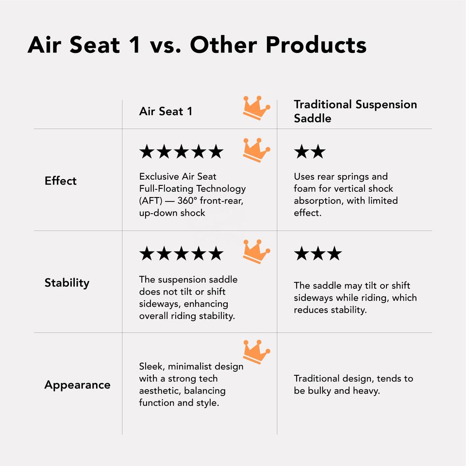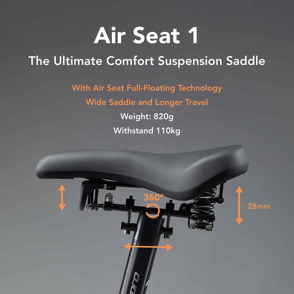เบาะจักรยานแบบ Air Seat 1 ระบบกันสะเทือนแบบลอยตัวเต็มรูปแบบ รับน้ำหนักได้ 110 กก. รางกลมขนาด 7x7 มม. ใช้ได้กับชุดแปลง