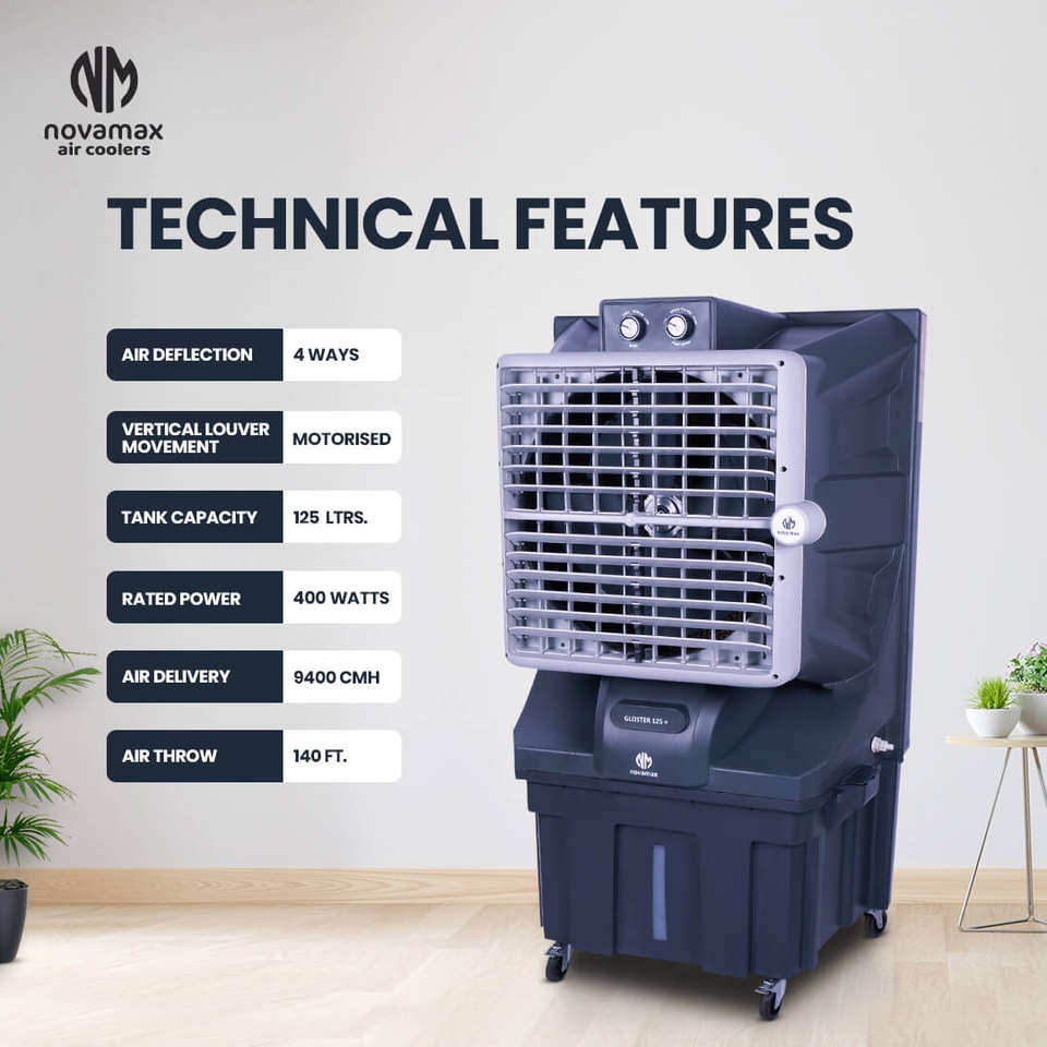 พัดลมไอเย็นสำหรับร้านค้า GLOSTER 125 ลิตร พร้อมระบบ AUTO SWING ให้ลมแรง เหมาะสำหรับการระบายความร้อนกลางแจ้งในงานอีเว้นท์และสวน
