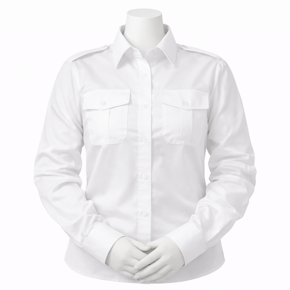 เสื้อเชิ้ตนักบินสายการบิน สีขาว ผ้าฝ้ายผสมโพลีเอสเตอร์ ผ้าซาติน แขนยาว พร้อมอีโบเล็ตที่ไหล่