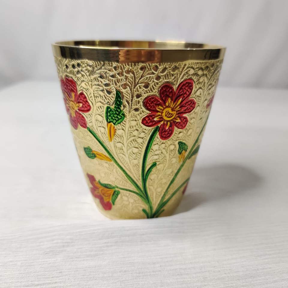 แก้วสีมีนาทองเหลืองสำหรับมอบเป็นของขวัญในพิธีบูชา ของชำร่วยในเทศกาล ผลิตในอินเดีย