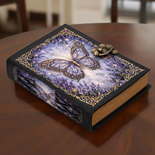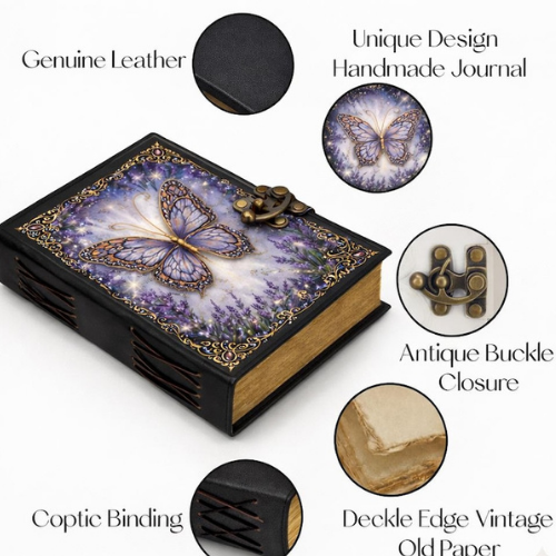 สมุดบันทึกหนังพิมพ์ลายผีเสื้อลาเวนเดอร์ทำมือ Al-Amir สมุดโน้ตปกแข็งสไตล์คลาสสิกสำหรับอ่านหนังสือแนวแฟนตาซี พร้อมตัวล็อคแบบโบราณ