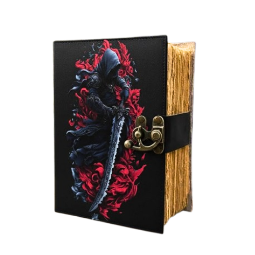 สมุดบันทึกหนังพิมพ์ลาย Crimson Reaper ทำมือโดย Al-Amir สไตล์โกธิคดาร์กแฟนตาซี ปกแข็ง สมุดโน้ตปีศาจ ตัวล็อคทองเหลือง แบบวินเทจ